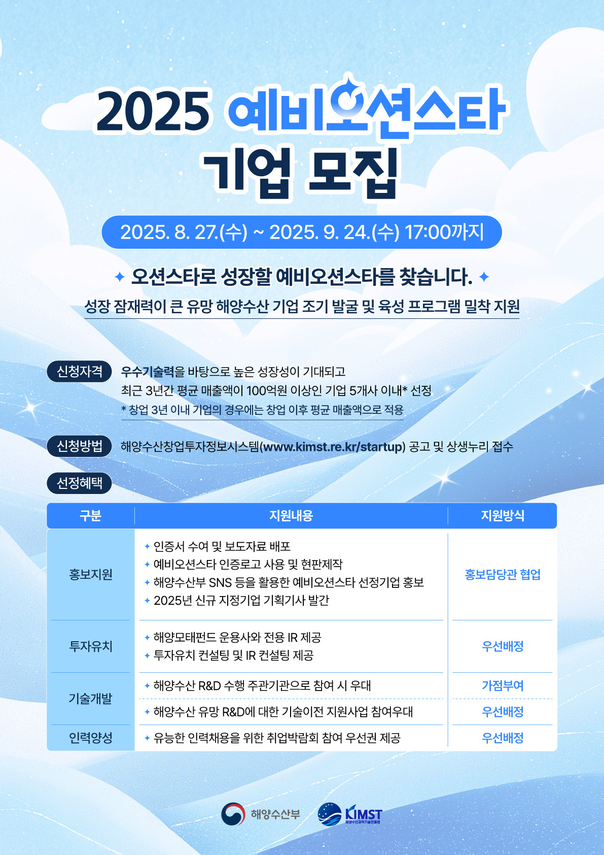 해양수산 유망기업 발굴 및 지원을 위해「2025 예비오션스타 기업」을 모집하고자 하오니 관심 있는 기업들의 많은 참여 바랍니다.