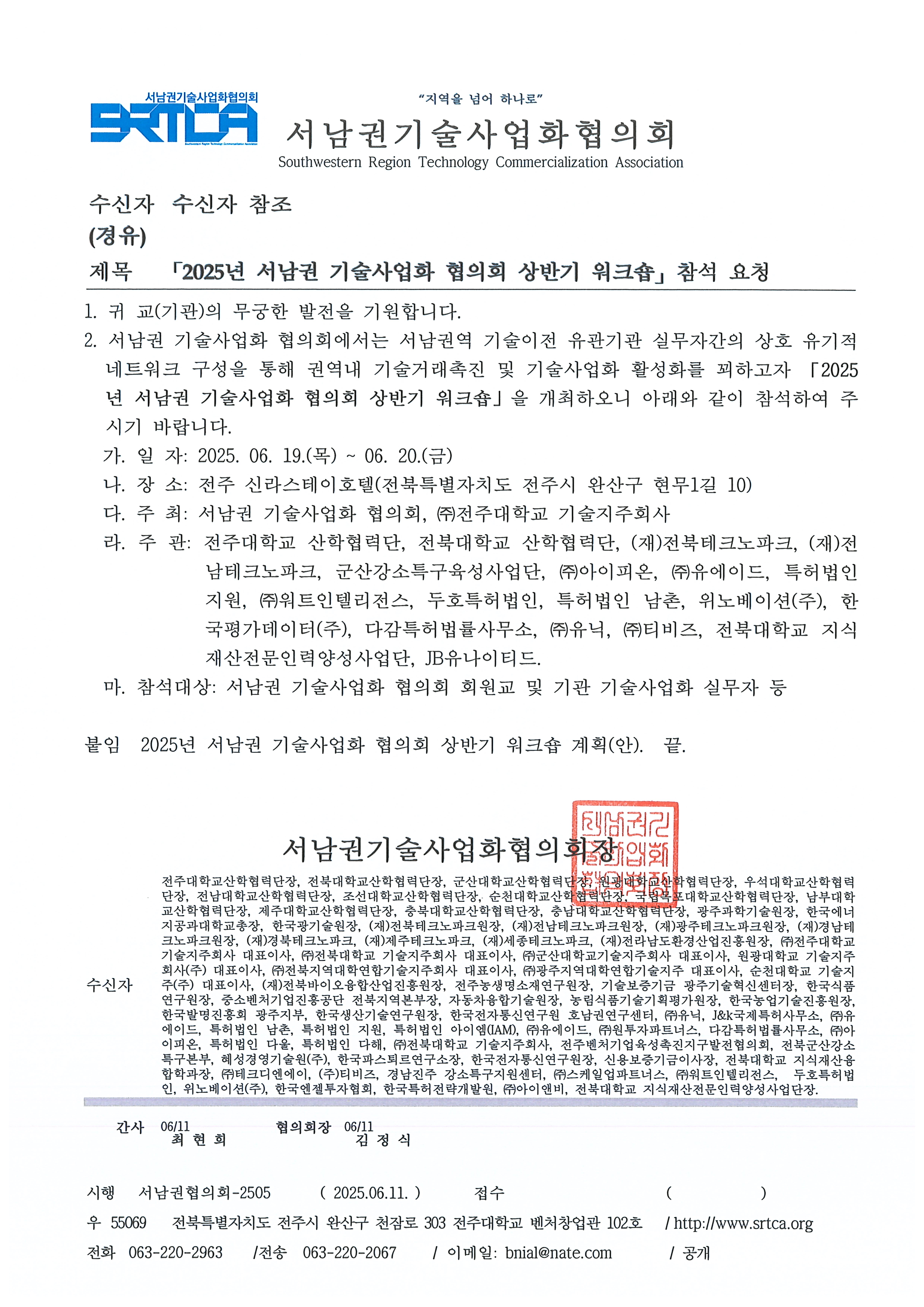 | 2025 서남권 기술사업화 협의회 상반기 워크숍 행사 세부일정 (0) | 2025.06.16 |