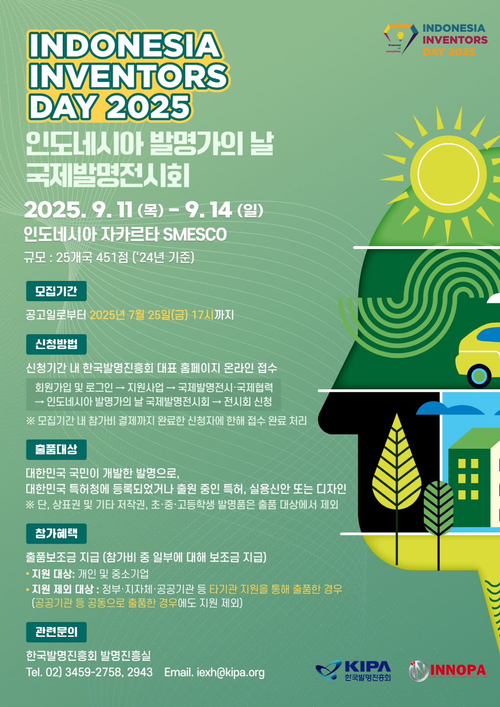 2025 인도네시아 발명가의 날 국제발명전시회 출품 모집과 관련하여 아래와 같이 안내하오니 많은 관심과 참여 바랍니다.