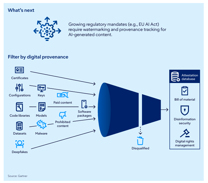 디지털 출처 검증은 AI가 생성한 콘텐츠나 오픈소스 소프트웨어, 서드파티 데이터의 출처와 진위를 입증하는 기술입니다. 소프트웨어 자재 명세서(SBOM), 디지털 워터마크, 인증 데이터베이스를 통해 데이터의 소유권과 무결성을 확인할 수 있습니다. 가트너는 2029년까지 이 영역에 충분히 투자하지 않은 기업이 수십억 달러 규모의 제재 위험에 직면할 수 있다고 경고했습니다. 생성형 콘텐츠가 급격히 확산되고 있는 현 시점에서, 디지털 출처 검증은 신뢰를 유지하기 위한 필수 조건이 되고 있습니다.