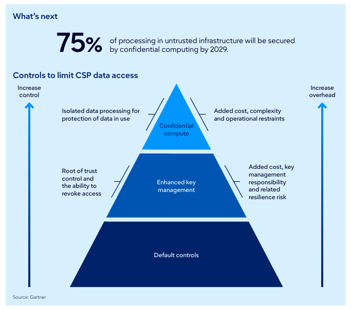 컨피덴셜 컴퓨팅은 데이터를 저장 중이나 전송 중이 아닌 사용 중(in-use)일 때도 암호화된 상태로 처리될 수 있도록 보호하는 기술입니다. 하드웨어 기반의 신뢰 실행 환경(Trusted Execution Environment, TEE) 내에서 데이터를 처리하기 때문에, 클라우드 운영자나 인프라 관리자조차 데이터 내용을 볼 수 없습니다. 가트너는 2029년까지 신뢰할 수 없는 인프라 환경에서 실행되는 업무의 75% 이상이 이 방식을 적용할 것으로 예측했습니다. 특히 금융, 헬스케어, 공공 부문 등 규제가 엄격한 산업에서 컨피덴셜 컴퓨팅은 데이터 주권과 보안성을 동시에 확보하는 핵심 수단으로 주목받고 있습니다.