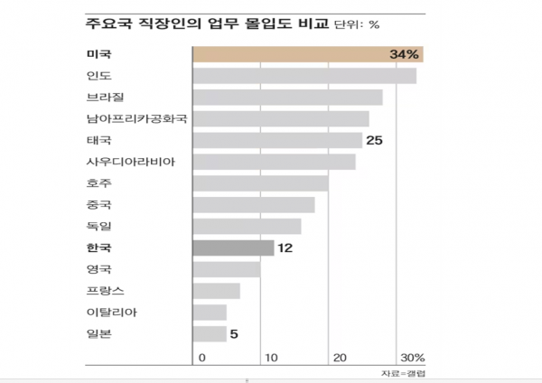 일본에서 최근 ‘업무 몰입’ 개념이 주목을 끄는 건, 일본 기업 근로자들의 ‘몰입도’ 성적표가 최근 글로벌 최악으로 조사됐기 때문이다. 미국 갤럽은 매년 전 세계를 대상으로 설문조사해 ‘업무 몰입’ 점수를 분석해 발표하는데 지난해 조사에서 일본은 5%란 꼴찌 점수를 받았다. 업무 몰입 관련 세계 평균 점수는 23%로, 해당 조사를 시작한 2009년(12%) 이래 꾸준히 증가하는 추세인데, 일본은 이런 트렌드를 따라가지 못했다. 한국도 12%에 그치며 세계 평균치의 절반 수준에 그쳤다.