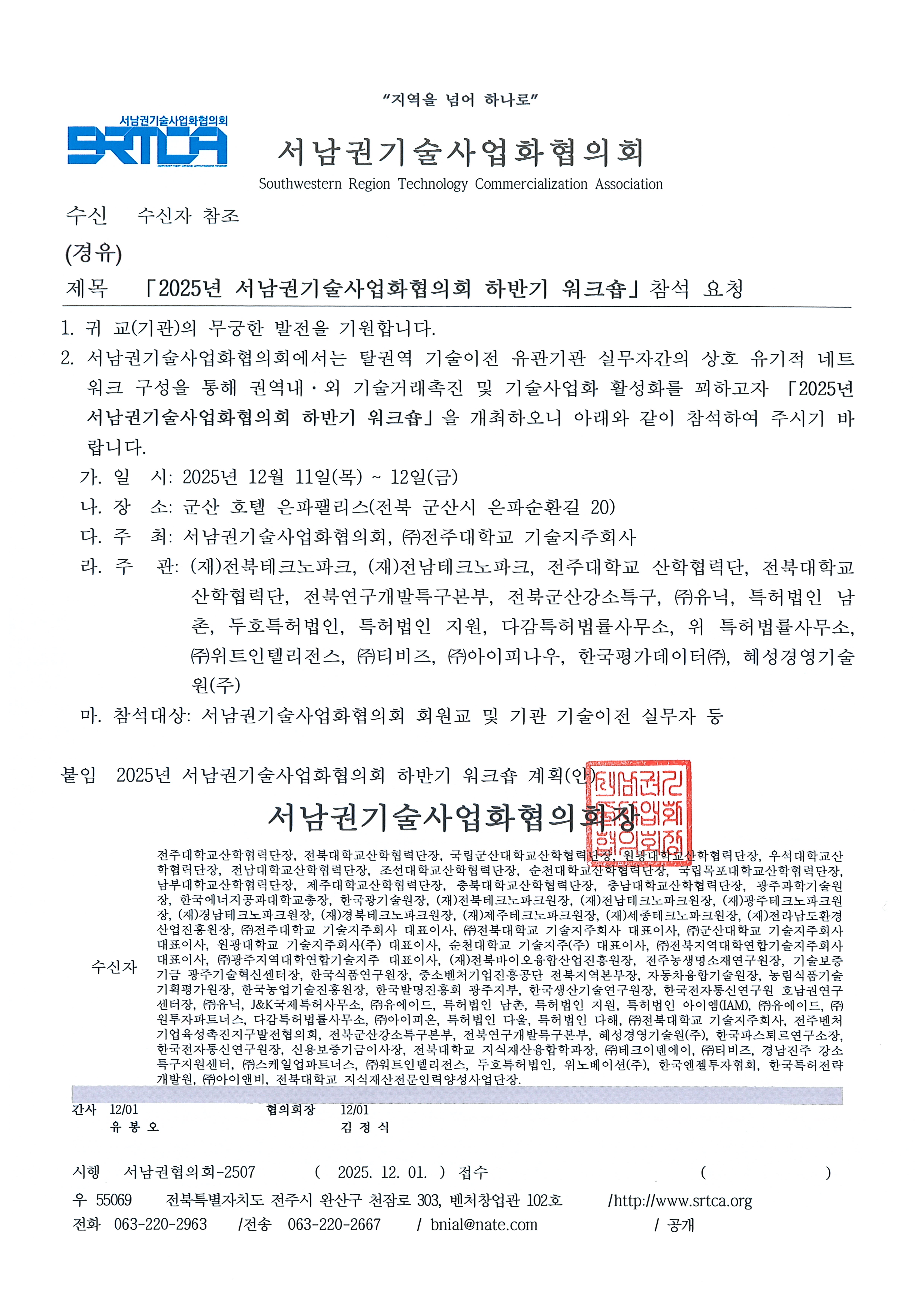 | 2025년 서남권기술사업화협의회 하반기 워크숍 안내 (0) | 2025.10.30 |