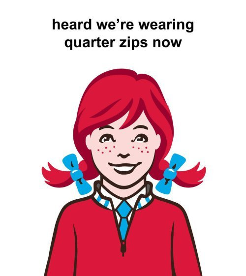 미국 패스트푸드 체인 ‘웬디스’의 마스코트가 쿼터집 스웨터를 입고 있다. 인스타그램 갈무리기업들도 이 흐름에 즉각 반응했다. 미국 패스트푸드 체인 웬디스는 자사 마스코트에 쿼터집 스웨터를 입히고 ‘쿼터 십(Quarter Sips)’ 프로모션을 선보였다. 명품 브랜드 샤넬 역시 새 컬렉션 오프닝에 쿼터집 스웨터를 올렸다.