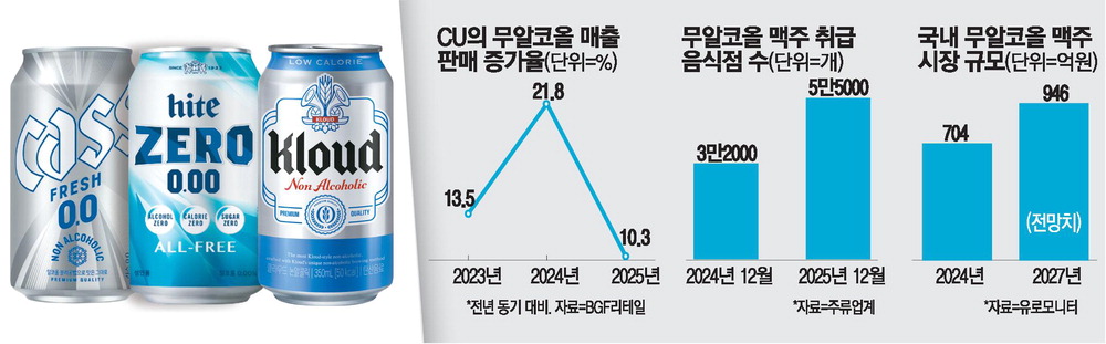 BGF리테일에 따르면 CU의 무알코올 맥주 매출은 2023년 10.3%, 2024년 21.8%, 2025년에도 13.5%의 성장률(전년 대비)을 기록하며 꾸준한 상승세를 이어가고 있다.
